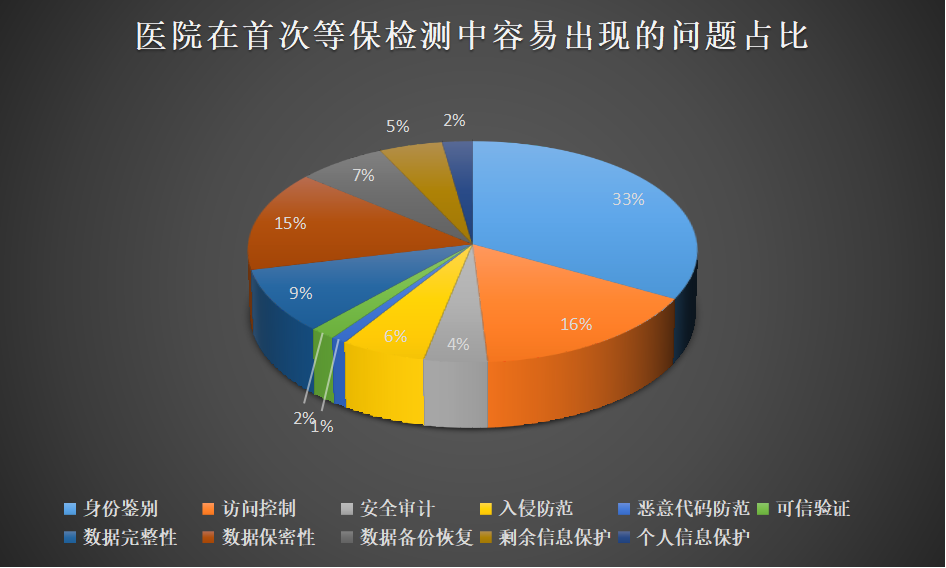 我们经过统计后发现,医疗机构在身份鉴别、访问控制和数据完整性三个方面,在等保测评中存在不符合(或部分符合)要求的项目相对较多。