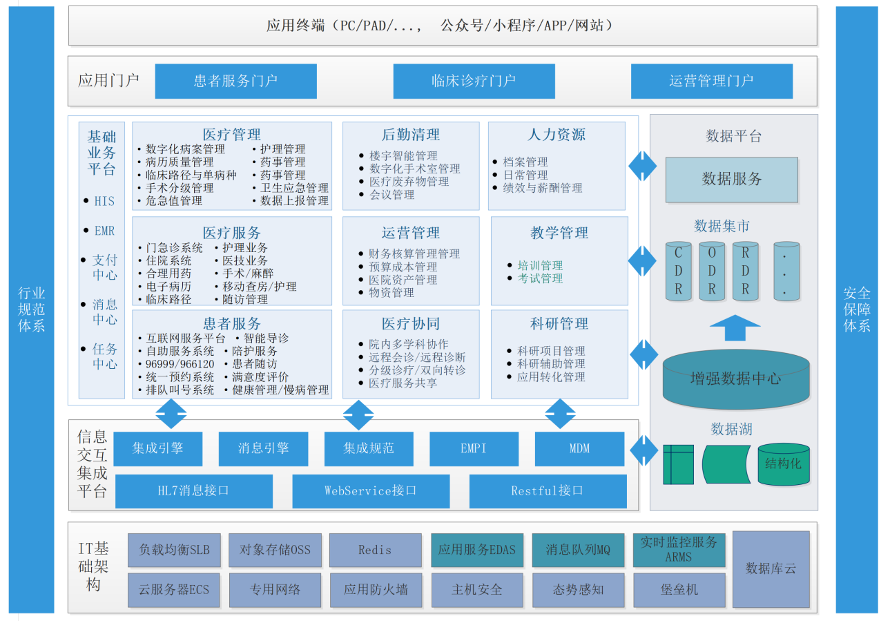 (6)保障体系: 行业规范体系、数据安全体系,为医院信息化建设指引方向和保驾护航。