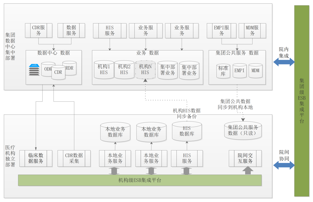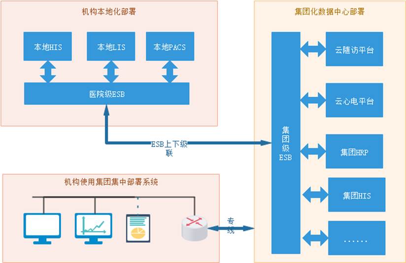 在架构部署上,为满足集团内部不同性质医疗机构的需求,支持两种部署方式: 一是集中化部署,机构通过专线接入使用; 二是机构本地化独立部署,与集团级平台进行对接协同。