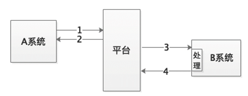 消息由A系统发出,系统对消息内容进行处理后,发给B系统处理,B系统收到消息后,开始同步处理,处理完成后把处理结果发给集成平台,平台返回给A系统。