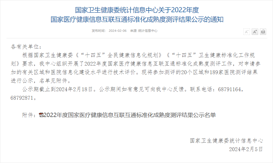 由 Odin Editor, 12 二月, 2024 登录或注册以发表评论 关键字 互联互通测评 近日,国家卫生健康委统计信息中心发布《2022年度国家医疗健康信息互联互通标准化成熟度测评结果公示名单》(以下简称《通知》),并对参加测评的20个区域和189家医院测评结果进行公示。 公示名单中,有多家采用Odin引擎的医疗机构通过互联互通五级乙等或四级甲等,在此祝贺所有通过测评的医疗卫生机构。 迄今为止,Odin已助力过百家医院和区域医疗机构通过了国家医疗健康信息互联互通标准化成熟度四甲或五乙测评。 Odin将持续创新,支持医院开展互联互通成熟度测评认证、电子病历系统功能应用水平分级评审,让集成平台真正用到实处,做到 "能用"、"敢用"、"好用" , 破解集成平台建设痛点 ,将集成平台真正“ 用到实处 ”,助力未来20-30年新一代医院信息系统的建设。 Odin文章评论: