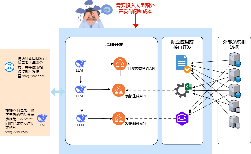 2. AI大模型同各系统打通复杂繁琐:AI大模型在对接外部应用时,需要投入大量研发成本,并且难以在不同项目间复用,开发复杂繁琐成本高。