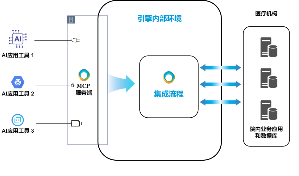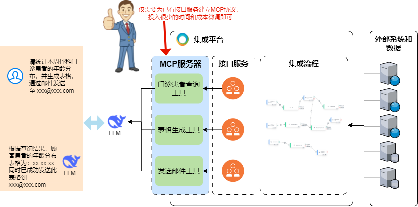 集成平台具有强大的集成能力,同时可以对外将HIT数据资产通过API服务的方式统一发布,解决了数据碎片化、获取难、管理繁等问题,而MCP协议的引入,则为集成平台提供了同LLM交互的标准框架,原有APIs无需调整即可快速转换为模型可识别的“工具集”,为LLM提供所需的现实数据。