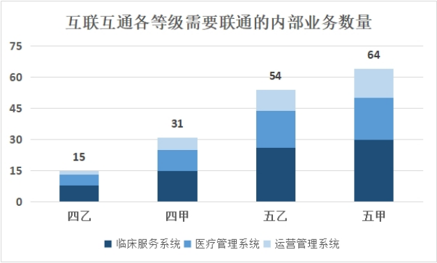 平台联通业务范围分为对基于平台的内部联通业务和基于平台的外部联通业务。 对于内部联通的业务,四甲及以上要求系统必须基于信息平台实现内部联通,且接入平台的系统数量对于每个不同的等级都有着明确的指标(见表2),可以看到从四乙到四甲再到五乙,所需接入的最低系统数量快速增加,五乙评级要求共需要接入至少54个系统,而五甲所需接入的系统数量达到了64个。