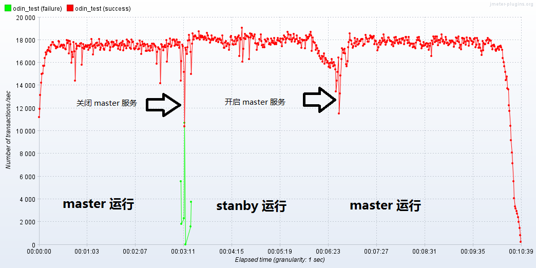 2. 切换至 standby 服务器稳定运行 3 分钟后,恢复 master 上的 Odin 引擎服务,后台自动 failback 切换到主服务器执行。 (无失败消息,性能短暂下滑)