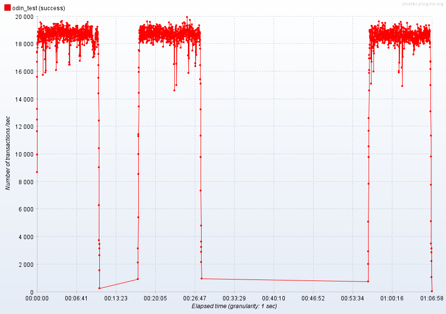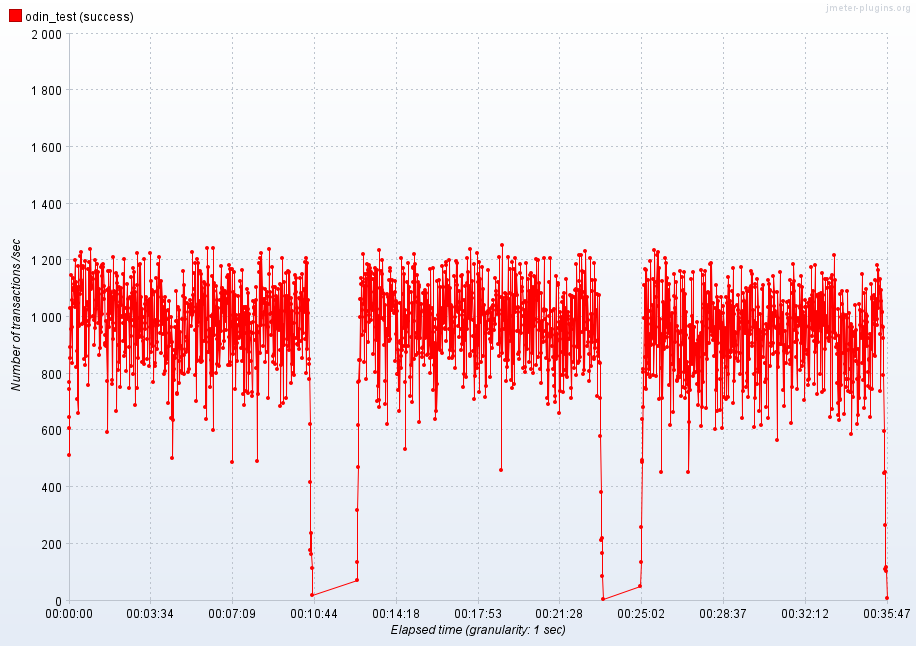 1. 压力测试执行至 3 分钟左右,关闭主服务器(master)上的 Odin 引擎服务,任务自动切换到备用 (standby) 服务器继续执行。 (有少量失败消息)