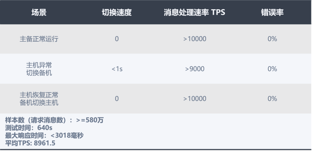 测试结果显示,在平滑切换模式下,开启重试策略机制, Odin 引擎主备切换时间约为 3s,高并发情况下主备切换时可实现错误率为 0%; 待主服务器恢复正常后,业务能够平滑的切换回主服务器且无错误。