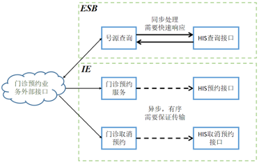 在这个场景中,号源查询业务适合通过ESB实现(若使用IE实现则效率太低,性能上不能满足三甲医院业务需求),而门诊预约和取消预约业务适合通过IE实现。 在处理一个外部入口的所有请求时,需要根据具体业务中数据的传输模式要求不断进行调整。