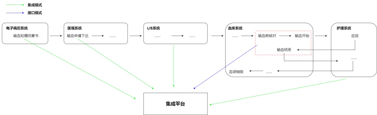 以我院住院输血闭环为例,该闭环包括21个流程节点,涵盖电子病历、医嘱、LIS、血库、护理等多个系统(大致流程如图1所示)。为了在满足需求的同时充分利旧,降低对现有业务的影响,需要对原有的服务和数据接口进行复用,实现闭环所需数据的分流。在输血知情同意书、输血申请下达等流程节点,由于需要保障传输,采用集成模式实现;在输血前核对、输血开始和输血结束三个节点,需要护士通过PDA对患者进行扫码触发,对消息传输的实时性和响应速度都有较高要求,更适合采用接口模式。